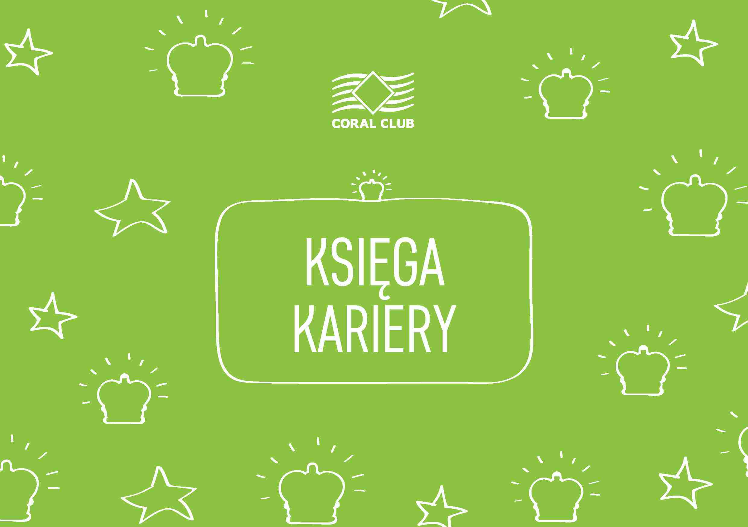 Księga Kariery wspiera pozyskiwanie nowych Klientów oraz Partnerów Biznesowych na drodze współpracy i rozwoju z Coral Club. Dzięki Księdze Kariery dowiesz się, jakie warunki należy spełnić, aby osiągnąć określoną rangę. Chcesz w ciekawy sposób przedstawić możliwości Coral Club? – Zabierz na spotkanie Księgę Kariery, która pozwoli Ci w obrazowy sposób przedstawić potencjalnemu Partnerowi Biznesowemu ścieżkę kariery od Asystenta do Gwiezdnego Mistrza!